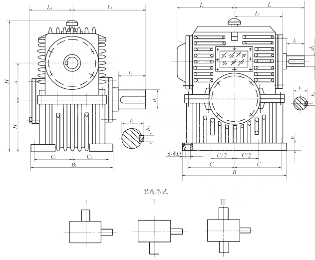 整體式PWO80、PWO100、PWO125、PWO140、PWO160、PWO180、PWO200、PWO225、PWO250、PWO280、PWO315、PWO355、型平面二次包絡(luò)環(huán)面蝸桿減速機(jī)主要尺寸(GB/T16449-1996)