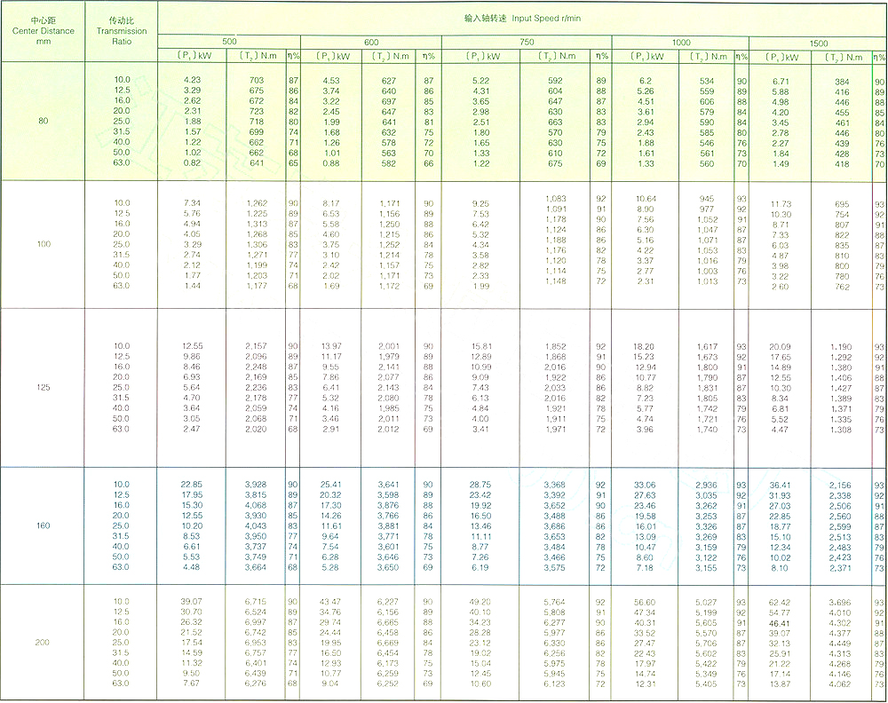 五、平面包絡環(huán)面蝸桿減速器額定輸入軸功率表