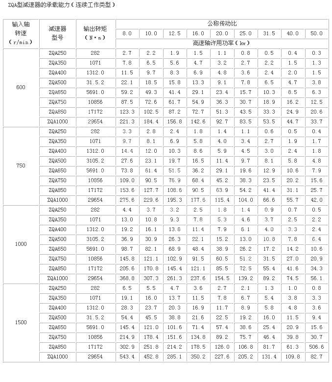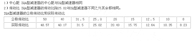 ZQA型減速器是在ZQ型減速器的基礎(chǔ)上改型設(shè)計的。為了提高齒輪的承載能力,又便于替代ZQ型,即安裝尺寸和外形尺寸、輸入和輸出軸伸不變的情況下,只改變齒輪的材質(zhì)和熱處理方式采用中硬齒面。并將ZQ型減速器的一級速比23.34改成25.02。