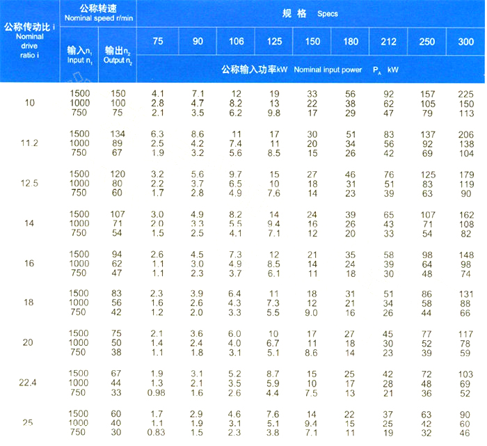 212、250、300九種規(guī)格。每一規(guī)格的傳動(dòng)比有10、11.2、12.5、14、16、18、20、22.4、25九種。