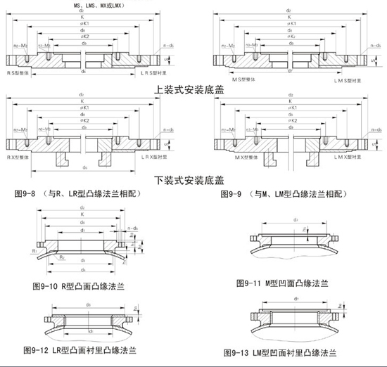 本系列安裝底蓋可與XD與型、XS型機(jī)架及2000系列機(jī)械密封火506、516、616型填料箱相配套,底蓋下面與R型、LR型、M型、LM型凸緣法蘭相配套,用戶根據(jù)XD型、XS型機(jī)架及凸緣法蘭的規(guī)格選擇相應(yīng)的安裝底蓋,若配用其他型號機(jī)架、機(jī)械密封、填料箱,只需將一下標(biāo)記中序號換成外徑d,注上相應(yīng)機(jī)架型號即可。