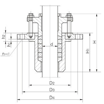 本系列填料箱適用于≤0.6MPa,設計溫度≤100℃,轉軸線速度<2m/s,其特點為填料函部分在安裝法蘭下面,能縮短安裝空間。